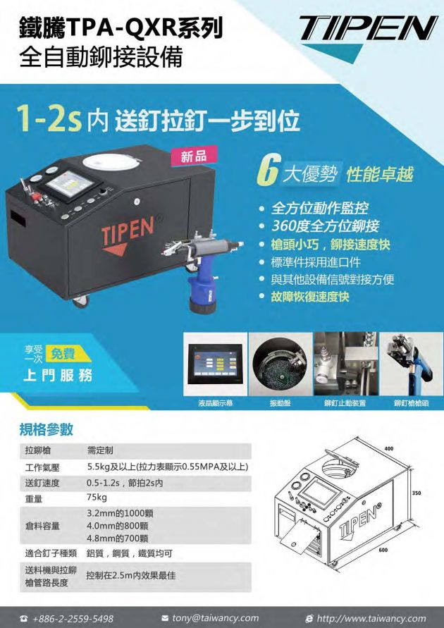 本產品能自動送釘,只需扣動拉釘槍的板機,機器會將拉釘輸送到拉釘槍的槍嘴上,免除雙手頻繁的操作,本產品可計數,儲存資料,並有多種報警功能。